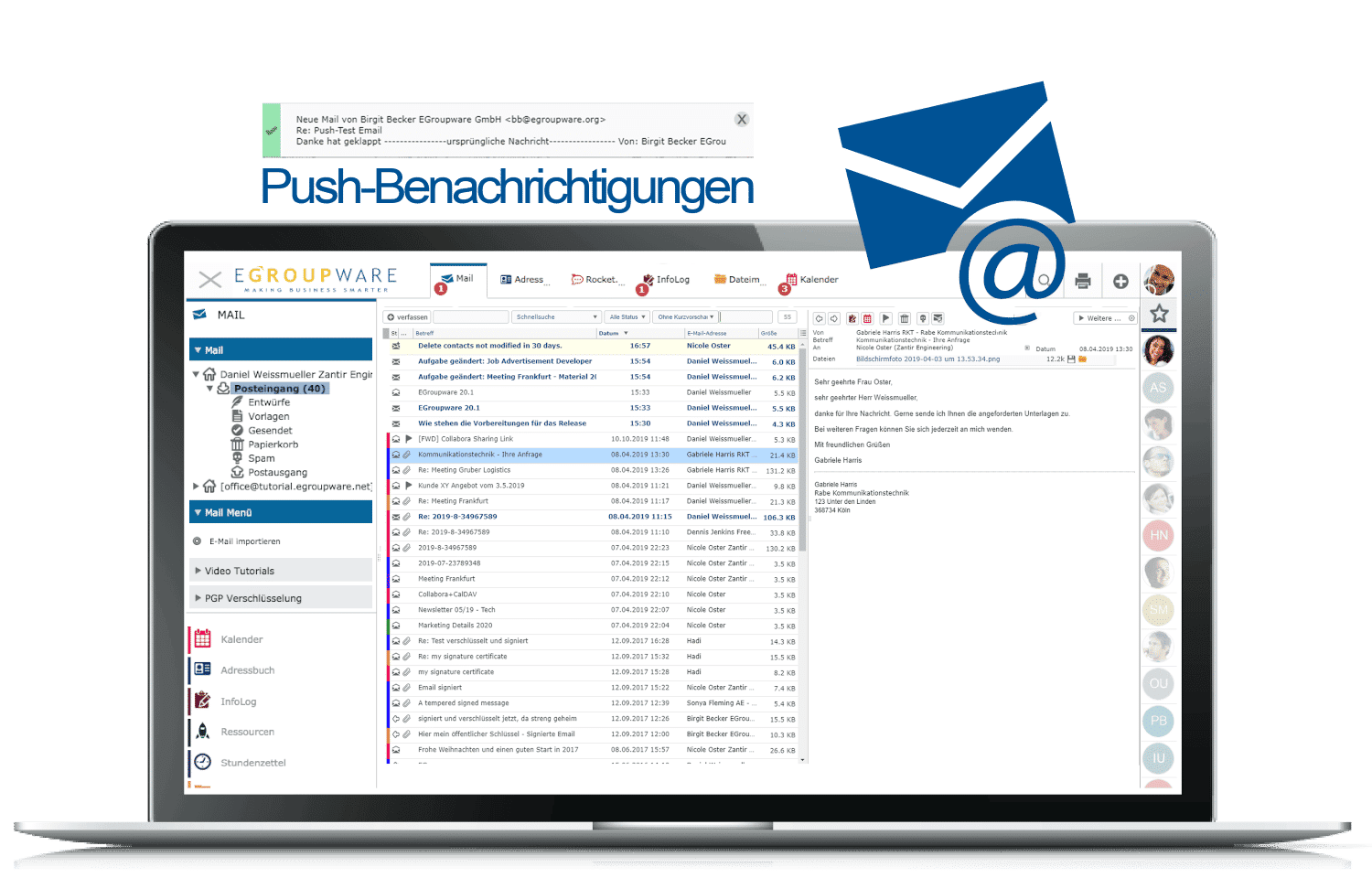 If a customer uses the email service of EGroupware or has configured his own Dovecot accordingly, he will receive a concise display of the newly received mails with sender, recipient account and subject line without delay thanks to this push technology.