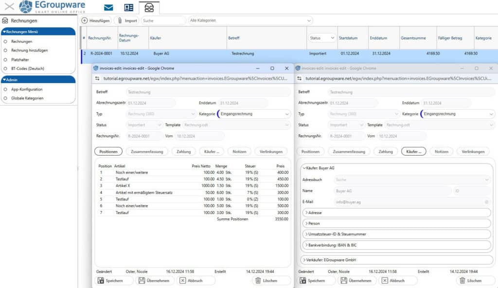 - Buyer: Select buyer information directly from the EGroupware address book or manually add additional contacts. You can also fill in optional fields like VAT IDs and tax number if required.