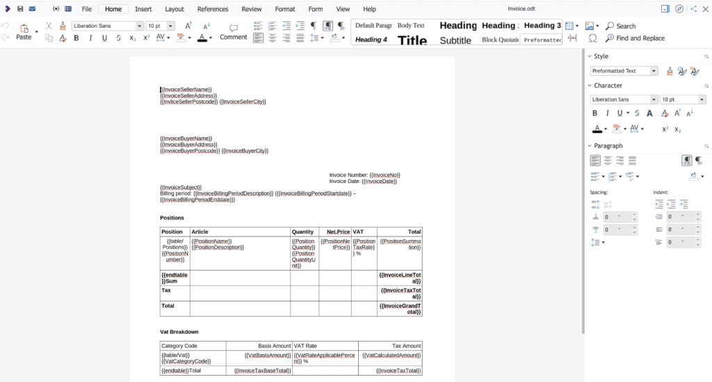We’ve included a ready-to-use template that you can adjust to match your style. All templates are stored in the /templates/invoices folder in .odt format. If you’ve saved multiple templates there, you can easily select one from a drop-down menu while creating an invoice.